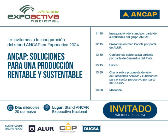 Empresas del grupo ANCAP estarán en la Expoactiva 2024 presentando sus desarrollos para el agro. Este evento, considerado como la muestra agroindustrial más importante del país, se desarrollará entre el 19 y el 23 de marzo.