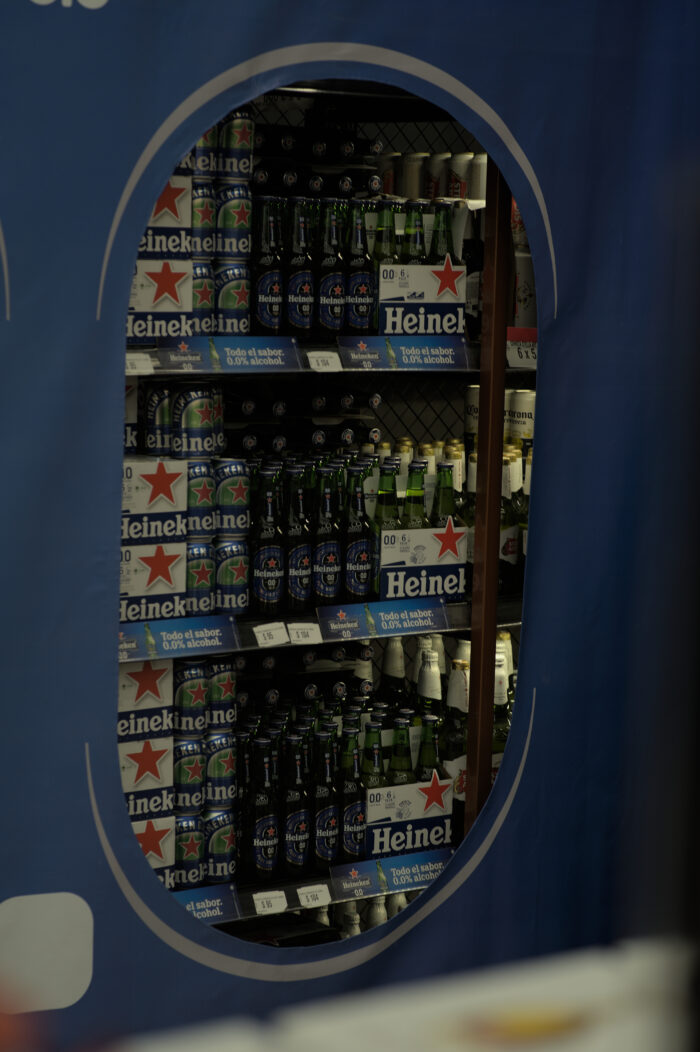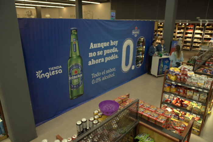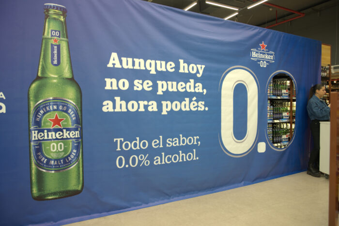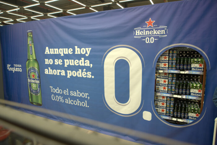 Este año, en Tienda Inglesa de Montevideo Shopping, los consumidores se encontraron la góndola de cervezas tradicionales cubierta por una lona que dejaba solo al descubierto la cerveza Heineken 0.0, en formato long neck 330cc y lata 350cc
